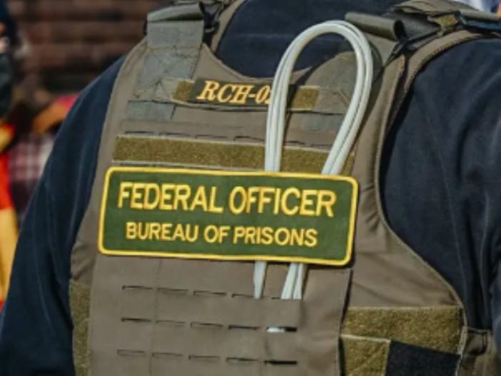 The man on the left wears a brown vest, labeled, “Bureau Of Prisons” with an identification number RCH-0, partially obscured.