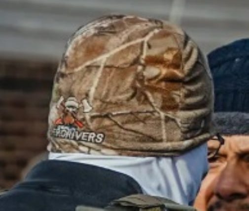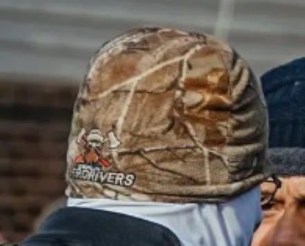 He wears a camouflage beanie, with a logo that appears to read, “Drivers.”